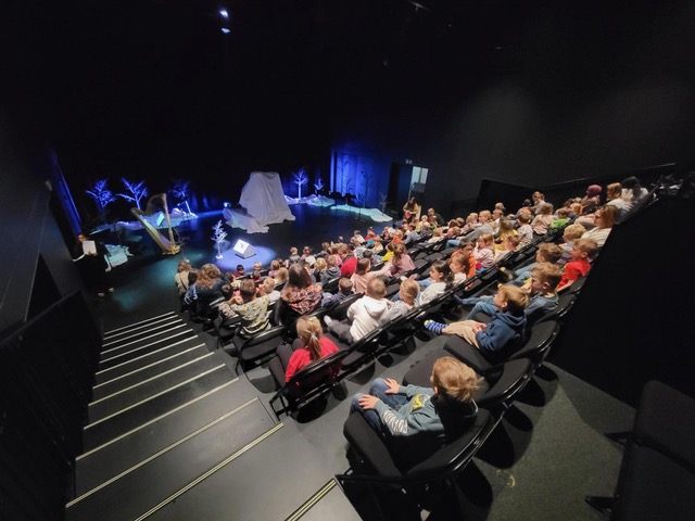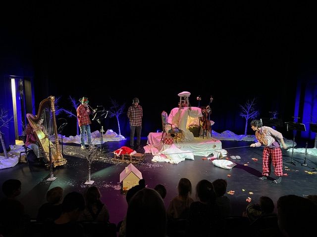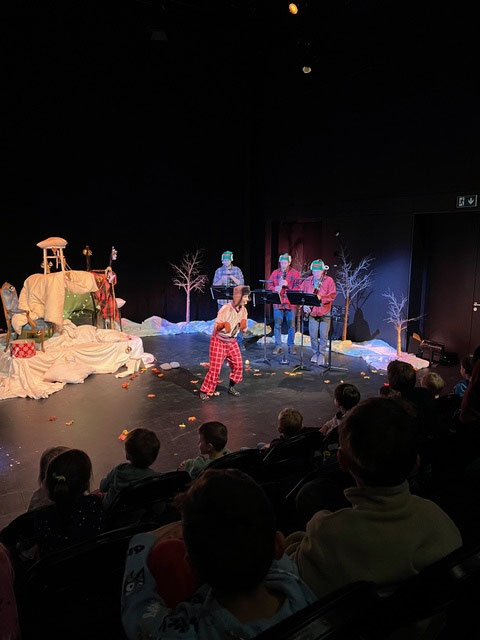 Mit viel Vorfreude machten wir, die Kindergartenklassen vom Neumatt 1 + 2, uns am 5. Dezember gemeinsam auf den Weg nach Basel. Nach einer aufregenden Reise mit der WB, dem Zug, einer kurzen Busfahrt und einigen Schritten zu Fuss erreichten wir schliesslich das Vorstadttheater. Nach dem gemeinsamen Znüni, der den ersten Hunger stillte, wurden wir gruppenweise in den Theatersaal geführt. Dort erwartete uns eine geheimnisvolle, in weiss gehaltene Bühne: ein kleines Häuschen, zierliche Bäume, ein grosses Leintuch, das etwas verbarg, sowie eine goldene Harfe und drei Notenständer. Die Spannung stieg!