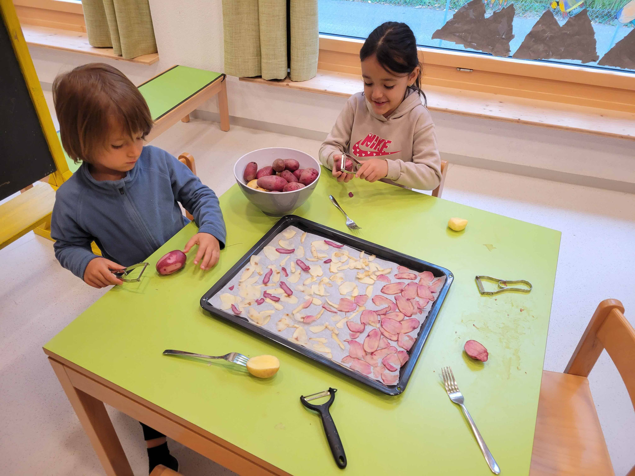 Wir hatten dieses Jahr viele Kartoffeln aus dem eigenen Garten. Einige davon haben wir gewaschen und dann mit dem Sparschälen in dünne Scheiben geschnitten. Die Scheiben wurden auf Backbleche mir Backpapier verteilt, dann mit etwas gesalzen und für 12 Minuten gebacken. Sie wurden super knusprig und lecker.