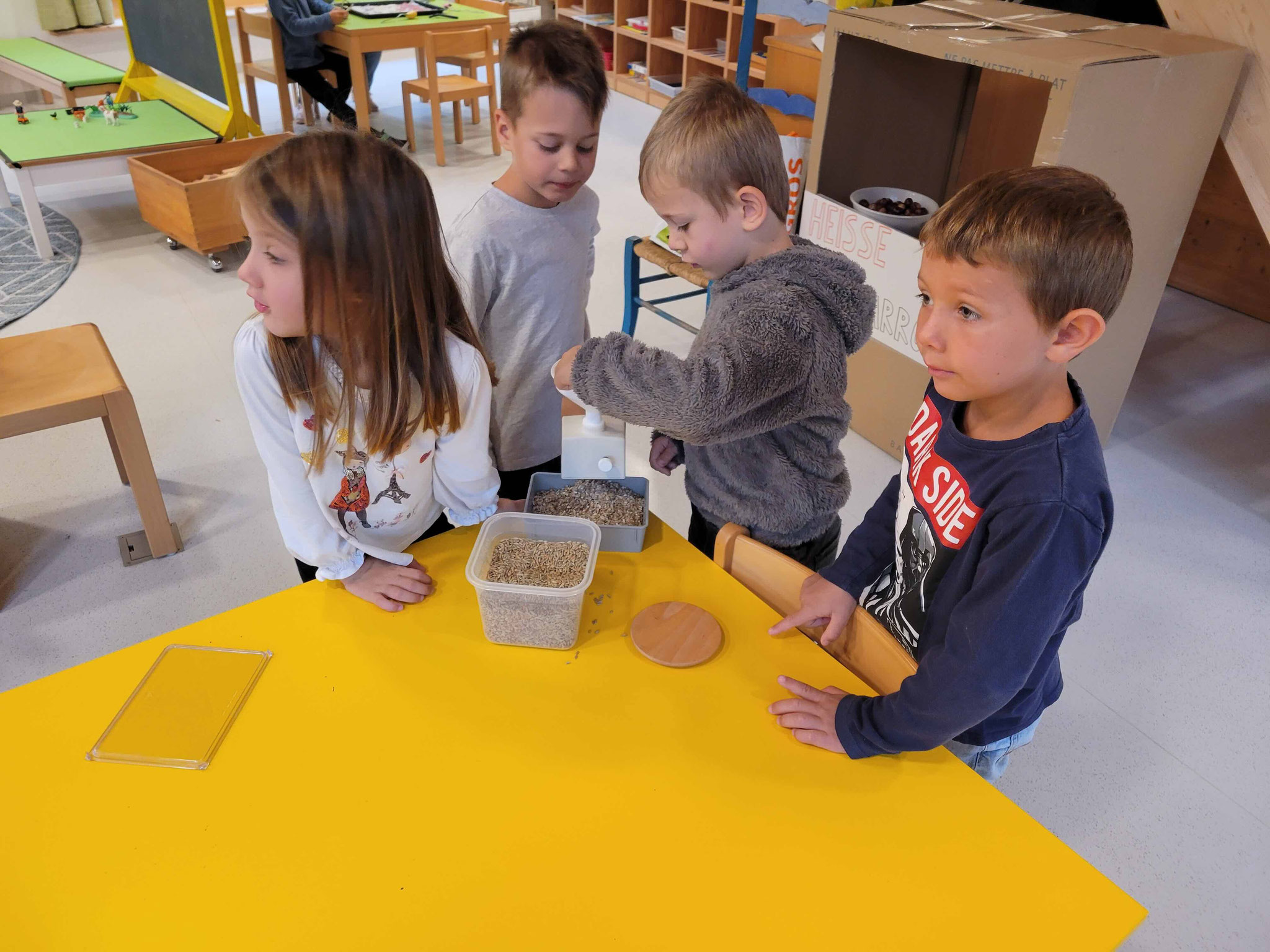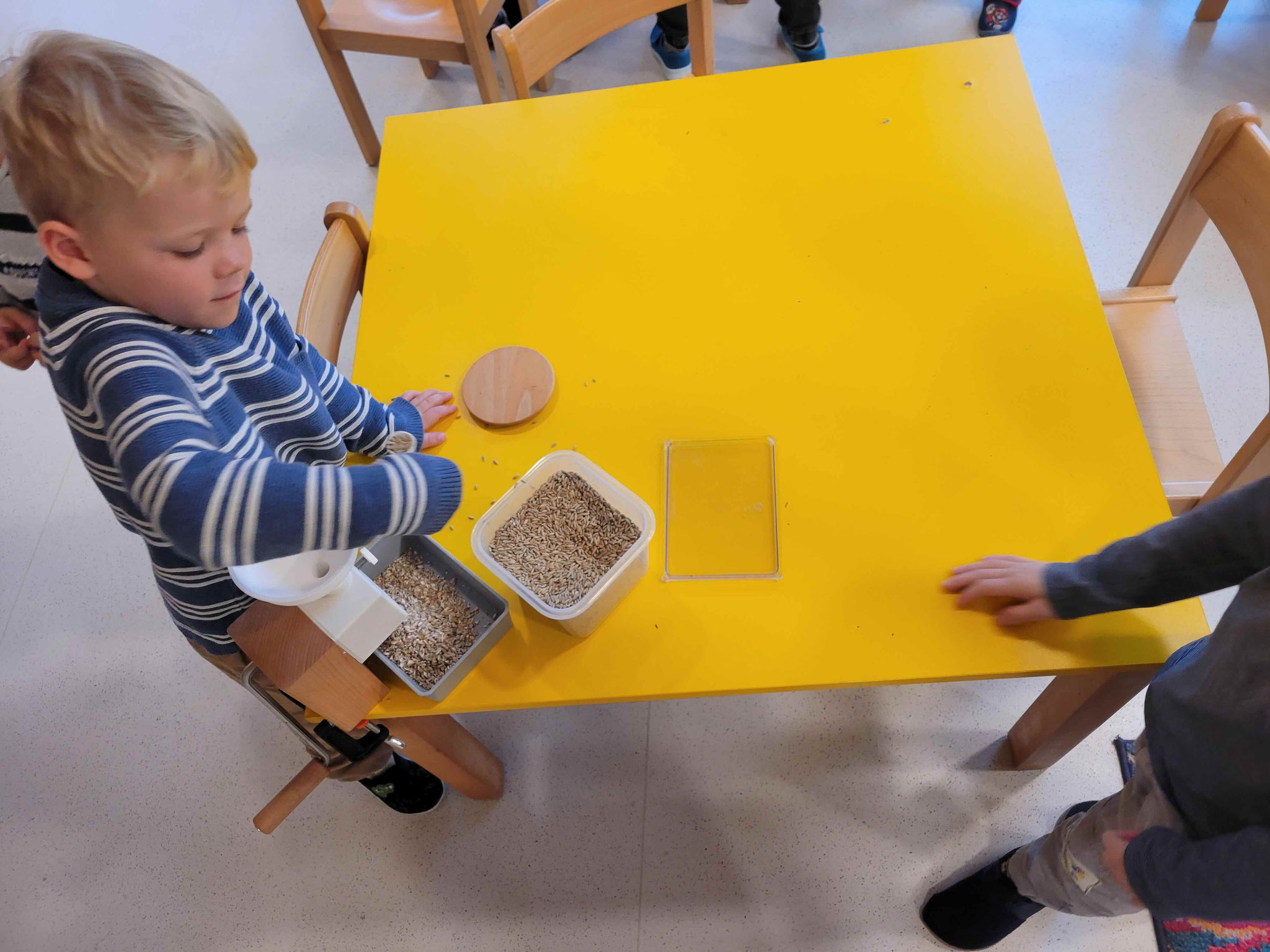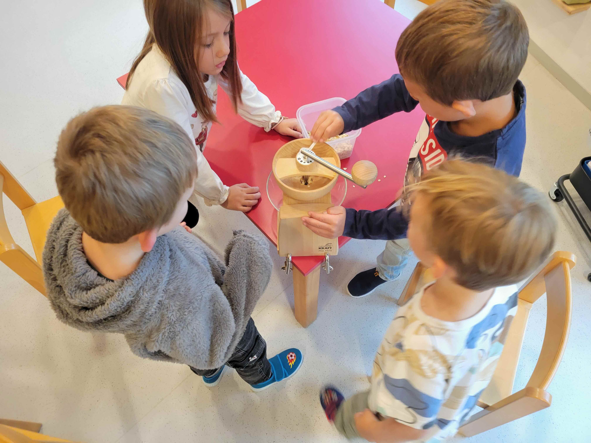 Aus den Flocken kann dann an einem anderen Tisch mit der Mehlmühle Mehl gemahlen werden. Das braucht etwas Kraft 😉