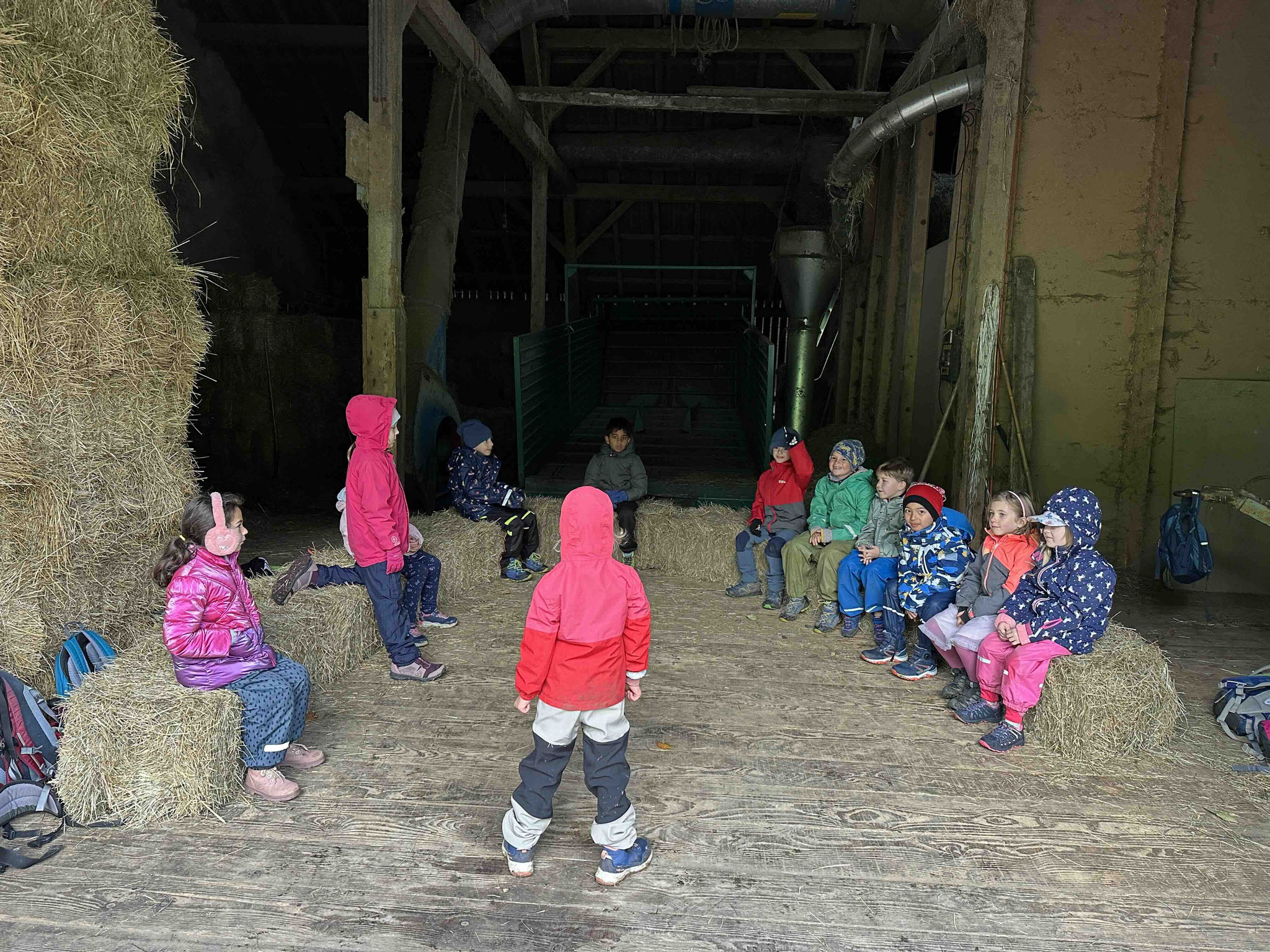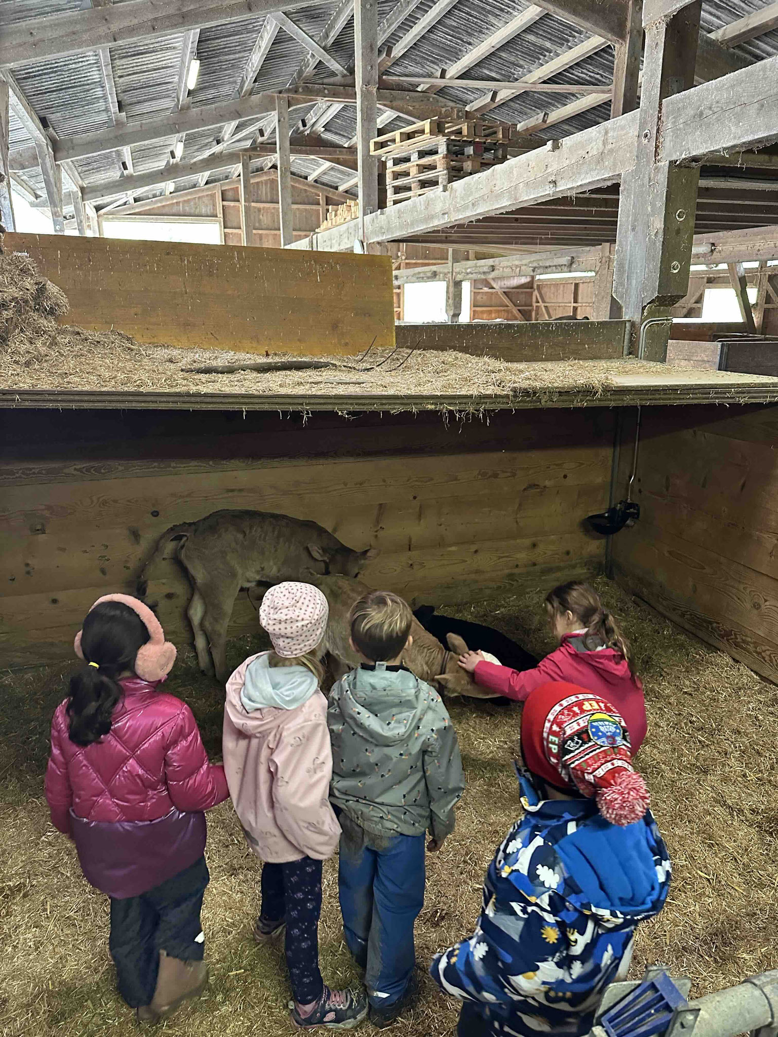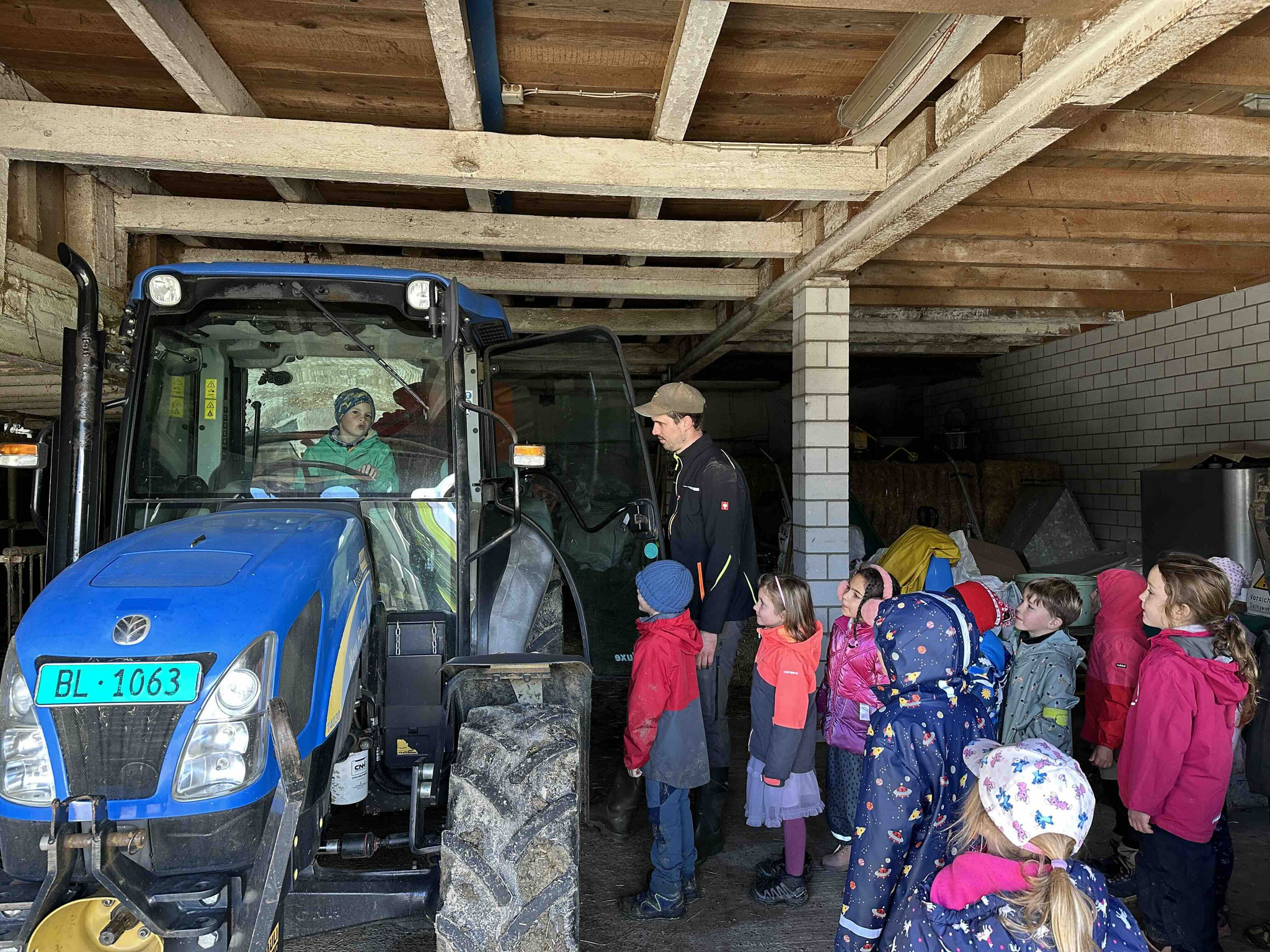 Am Freitag, den 24. Oktober, besuchten die beiden ersten Klassen, anlässlich des NMG-Themas, den Erlihof. Die Erstklässler:innen wurden in 3 Gruppen aufgeteilt und erlebten rotierend verschiedene Seiten des Hofes. Eine Gruppe wurde jeweils vom Besitzer über seinen Hof geführt. Die Kinder entdeckten dabei verschiedenste Tiere und deren Haltung. Insbesondere die Streicheleinheiten bei den Kälbchen und den Hasen sorgten bei allen Kindern für strahlende Gesichter. Sie besuchten auch die Melkmaschinen und lernten den dazugehörigen Ablauf für die Kühe kennen. Die Schüler:innen erfuhren, wie das Futter der Kühe zusammengesetzt ist und wann dieses verfüttert wird. Am Schluss durften alle einmal auf den Traktor sitzen.