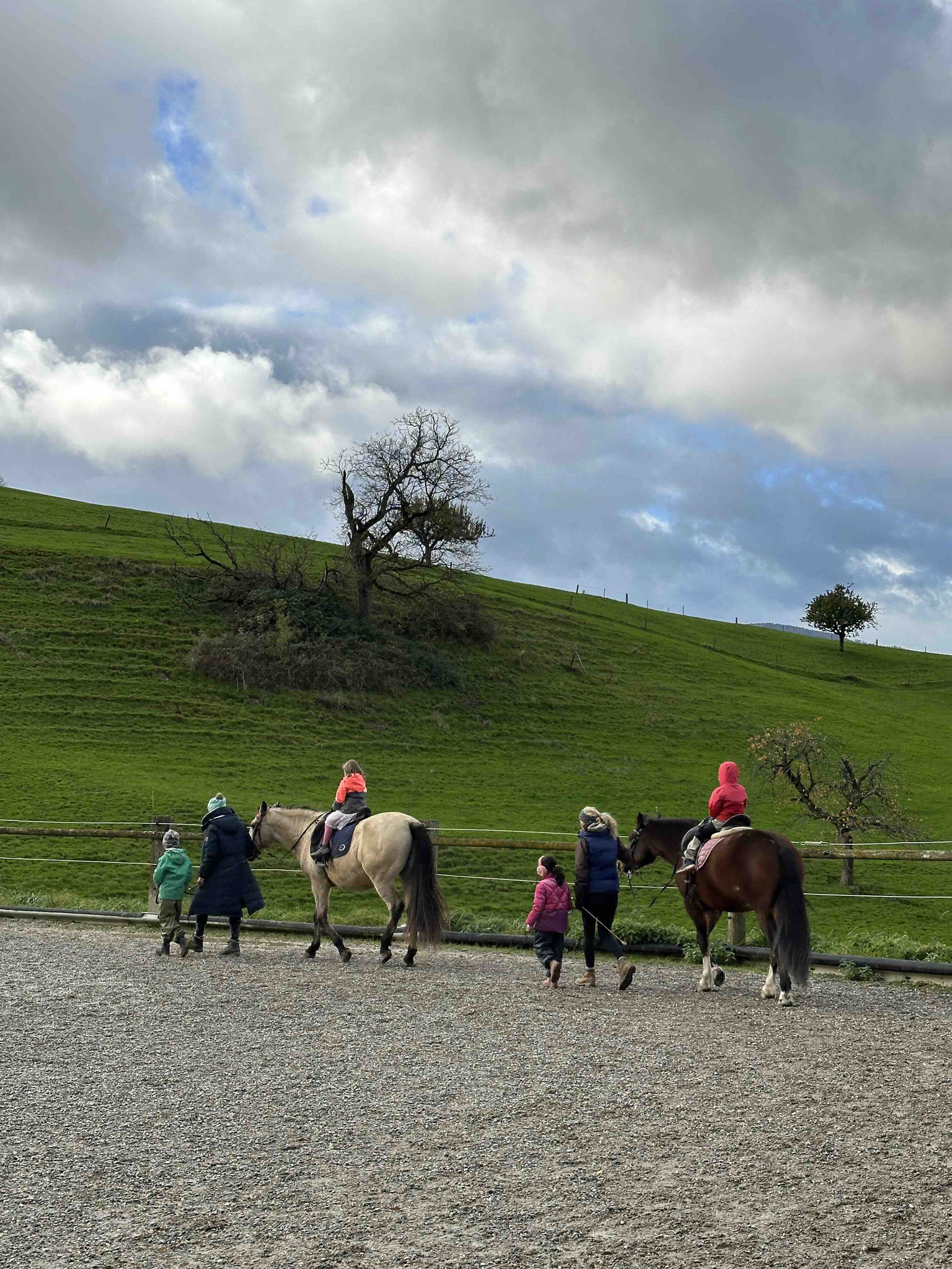 Die letzte Gruppe verbrachte die Zeit auf dem Reitplatz des Hofes. Dort trafen die Kinder auf die Pferde Heyla und Eclipse und deren Besitzerinnen. Die Kinder freuten sich riesig über die gedrehten Runden auf dem Platz und durften sich auch gegenseitig einmal herumführen. Zwischendrin wurden ihnen die wichtigsten Aspekte des Umgangs mit Pferden nahegelegt.