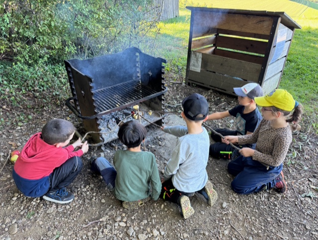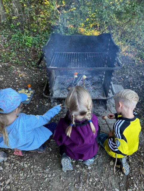 Oben angekommen haben die Kinder Holz gesammelt und wir haben ein grosses Feuer gemacht. Über der Glut durften alle ein Stück Apfel braten, welchen wir dann mit Zimt bestreut und genossen haben.