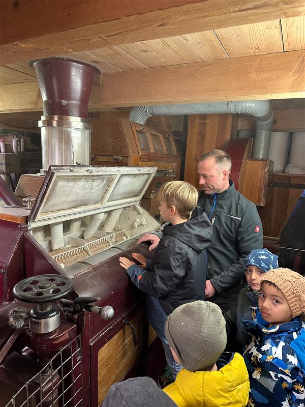 Im Moment beschäftigen sich die Klassen 1a und 1b im Unterricht mit dem Thema Bauernhof. Dazu gehört auch, dass wir wissen, wie aus Korn Brot entsteht. Deshalb besuchten wir am Dienstag, 4. November die Mühle in Maisprach. Dort hat uns der Müller Sämi das Wasserrad gezeigt, den Ablauf vom Korn zum Mehl geschildert und erklärt und am Schluss durften wir noch ein feines Brötli probieren.