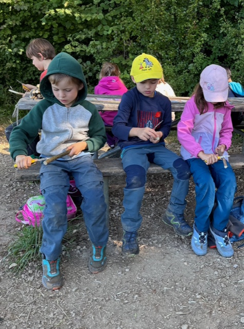 Die Kinder durften sich in Gruppen im Schnitzen üben und konnten ihre Haselstecken kunstvoll verzieren. Sie haben die wichtigsten Schnitzregeln gelernt und es war eindrücklich, wie gut die Kinder schon mit dem Sackmesser umgehen können.