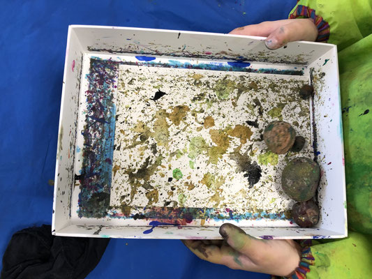 Ein weisses Blatt Zeichnungspapier wurde in eine Schachtel gelegt. Dann gingen wir so vor wie beim Pustebild: verschiedenfarbige Kleckse wurden auf das Papier getropft. Danach suchten die jungen