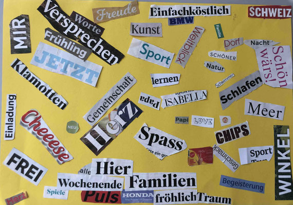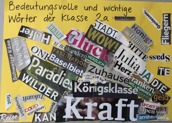 Die Klasse 2a hat sich auf die Suche nach bedeutungsvollen und wichtigen Wörtern gemacht. In Zeitschriften, Zeitungen, Prospekten und Werbeflyern wurde gesucht, ausgeschnitten und sortiert. Über die gesammelten Wörter wurde diskutiert, argumentiert und begründet. Am Schluss entstand ein Plakat mit allen wichtigen und bedeutungsvollen Wörtern, die gefunden wurden.