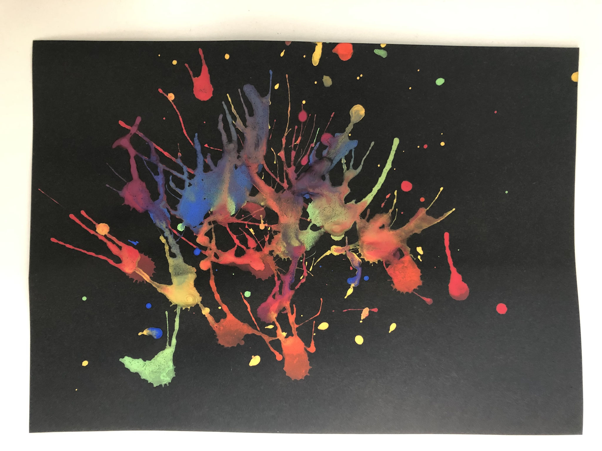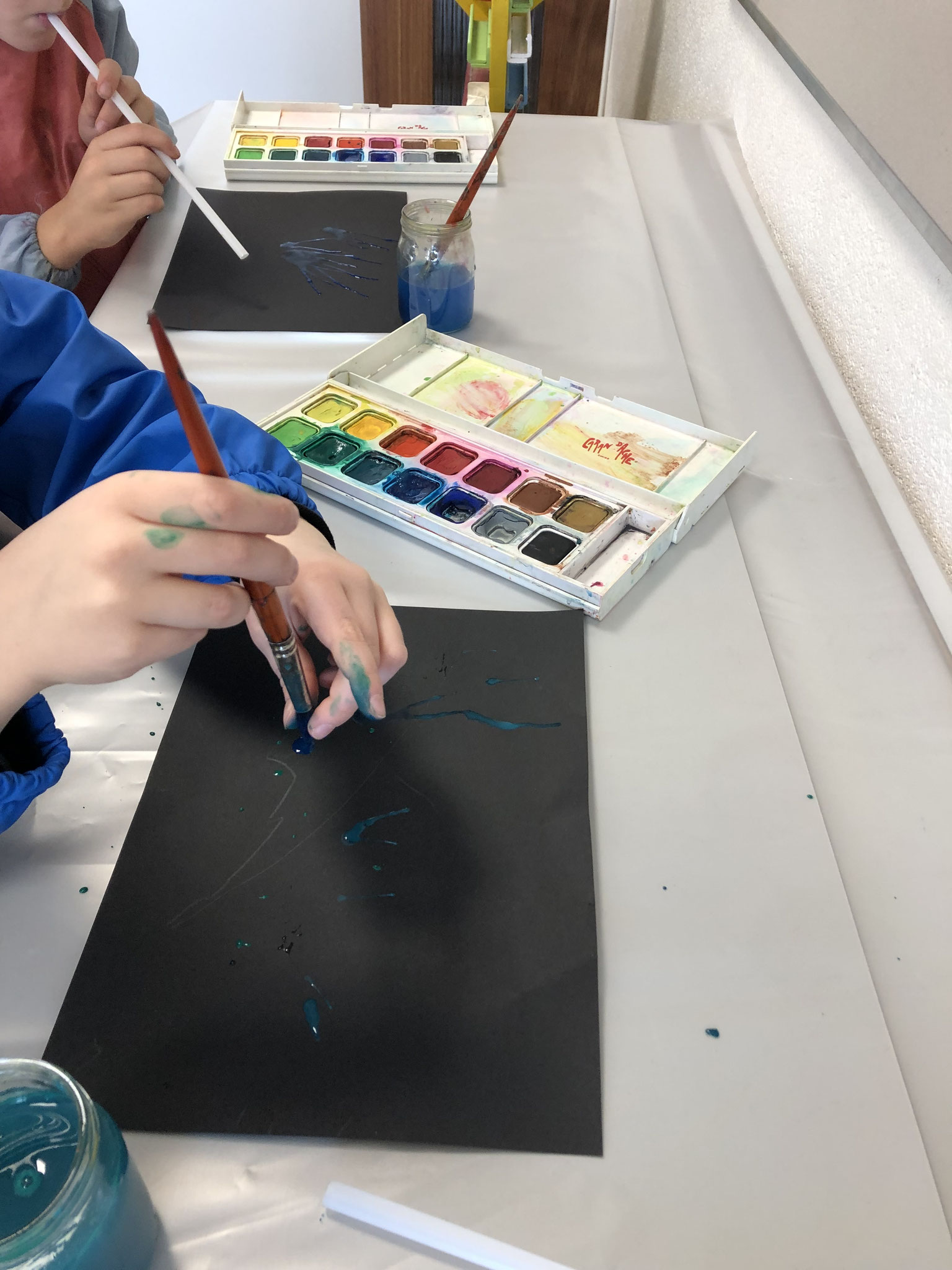 Mit dem Farbkasten und einem dicken Pinsel tropften die Schülerinnen und Schüler Farbe auf schwarzes Papier. Die so entstandenen Farbkleckse wurden mit Trinkhalmen und heftigem Pusten in feuerwerkartige Gebilde verwandelt. Dabei war es gar nicht so einfach, genug grosse Farbkleckse aufs Papier zu bringen. Nicht nur das Papier, sondern auch einige Hände waren zum Schluss ganz farbig. Doch es lohnte sich: es entstanden wunderschöne Feuerwerksmotive.