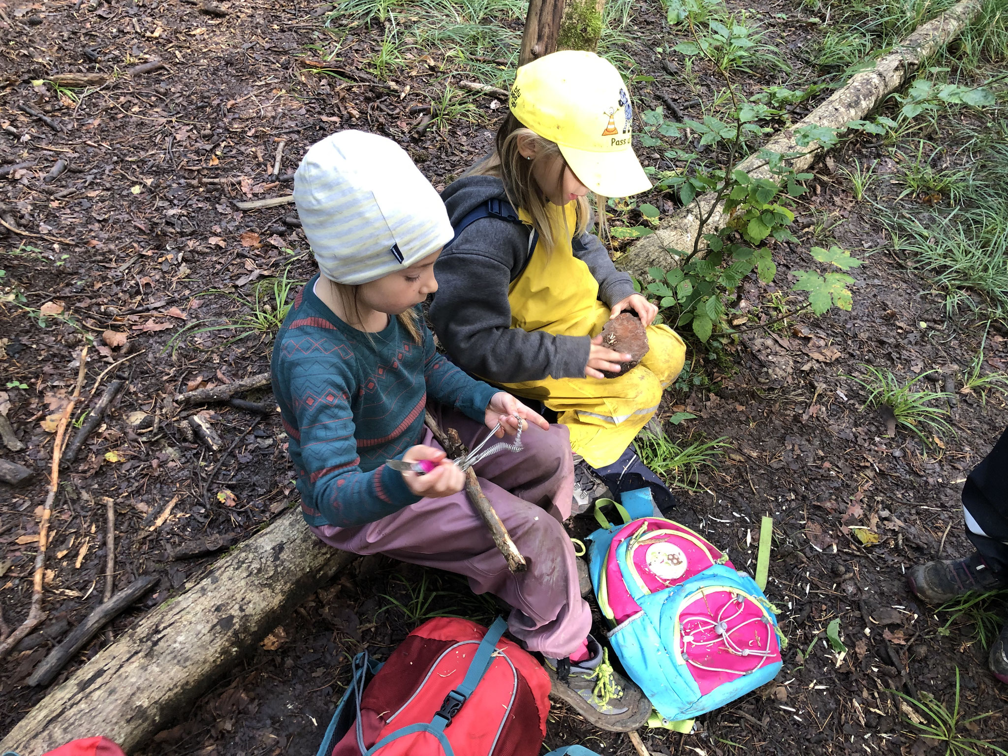 Der Ausflug zur Feuerstelle in der Nähe vom Chrotteweiher gefiel uns jedoch auch gut. Der Wind blies kalt und wir waren froh um das Feuer, an dem wir unsere Würste fürs Mittagessen brieten. Wir spielten im Wald, kletterten und schnitzten mit unseren Sackmessern. Alle schafften es, einen Haselast anzuspitzen. Darauf waren nicht wenige sehr stolz. Ausserdem lernten wir, warum die Linde Propellerfrüchtchen hat und bastelten auch gleich einen eigenen Papierpropeller.