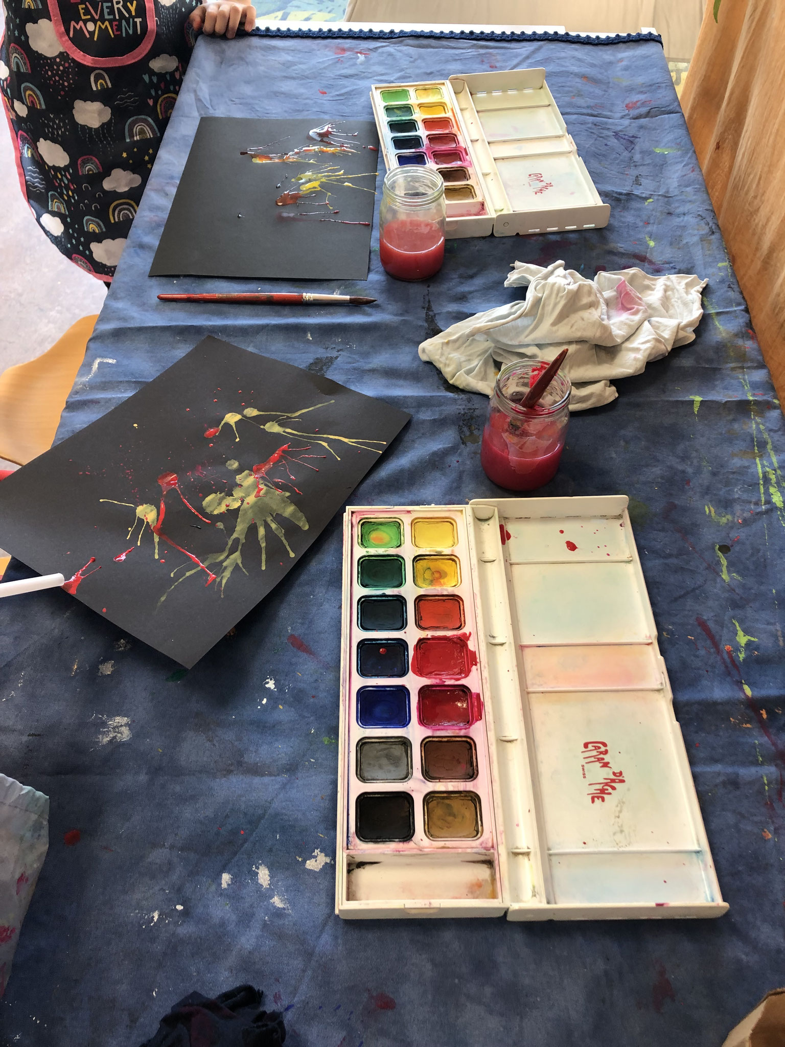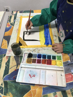 Zum Abschluss durfte die Klasse auf grossem weissem Papier konventionell mit einem Pinsel Bilder malen. Dabei benutzten sie, wie bei den oben beschriebenen Techniken, den Farbkasten. Sie waren