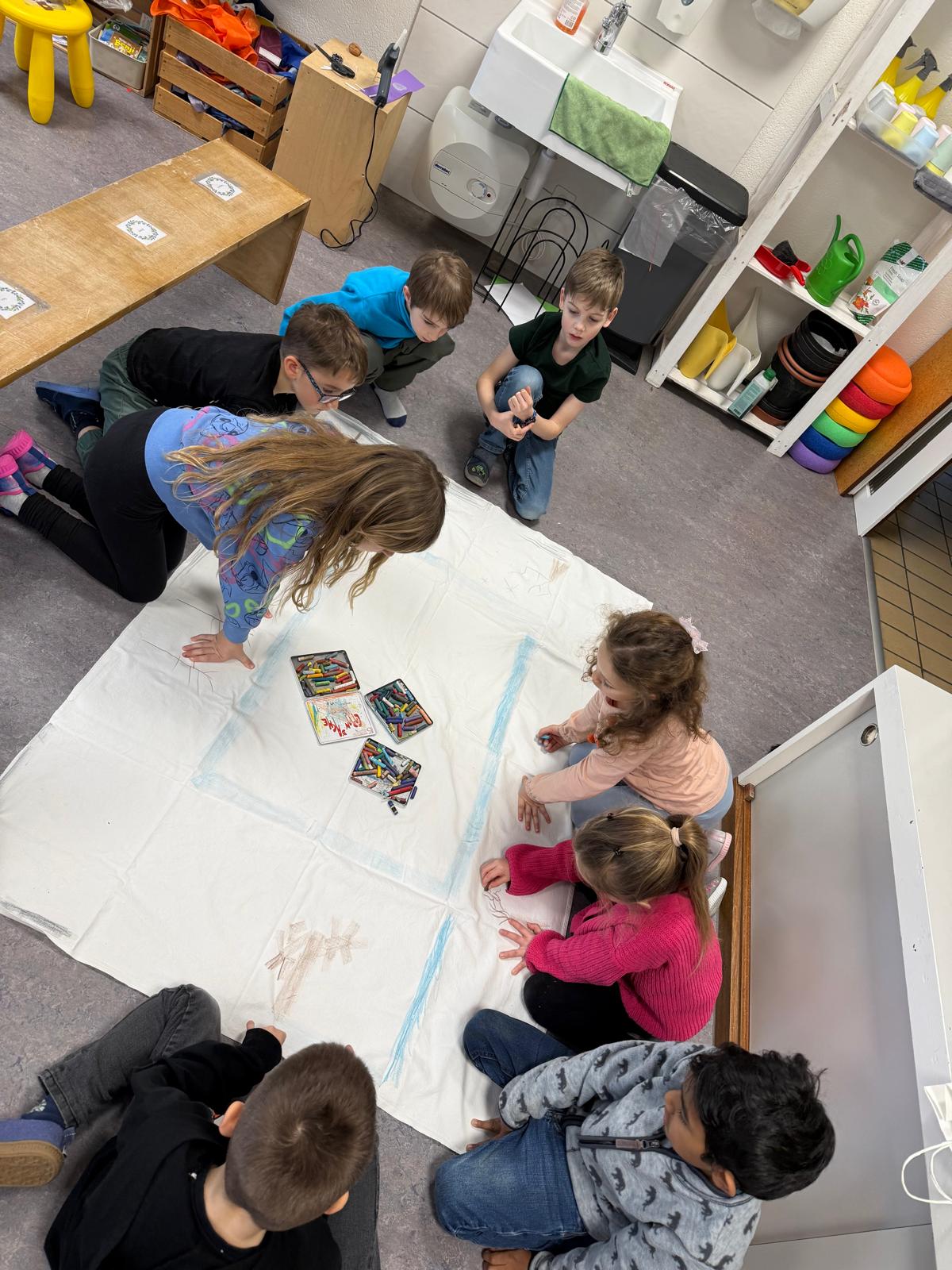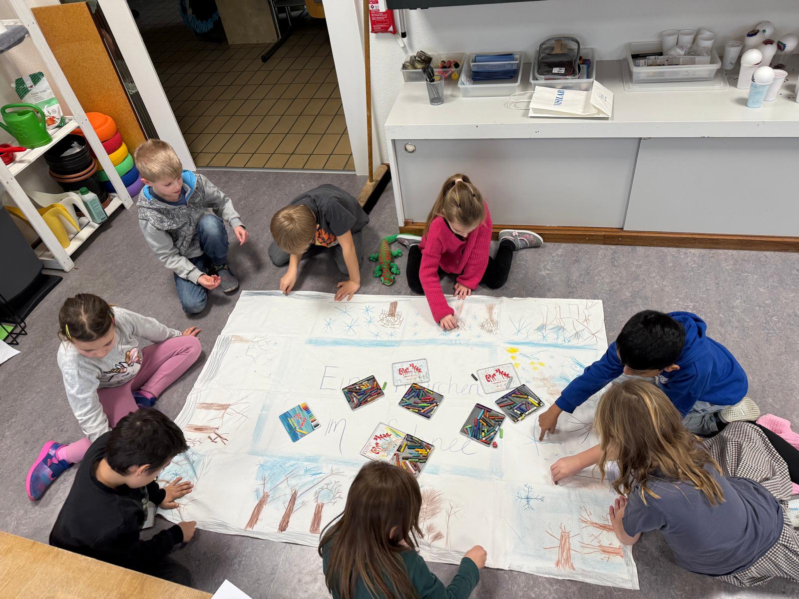 Als Höhepunkt haben wir dann zum Abschluss noch eine grosse Winterlandschaft auf einem Leintuch gemalt. So konnten die Kinder auch zwischendurch ein Tischtheater spielen und üben.