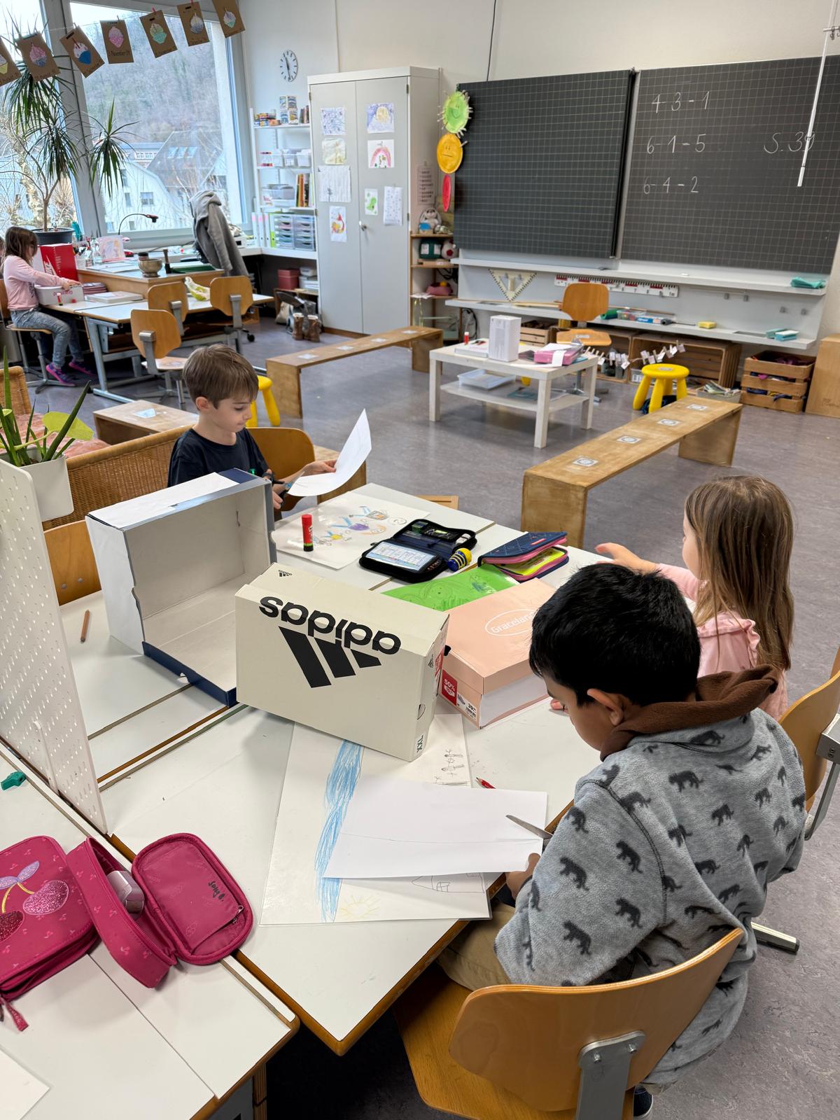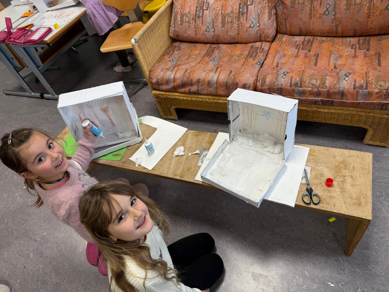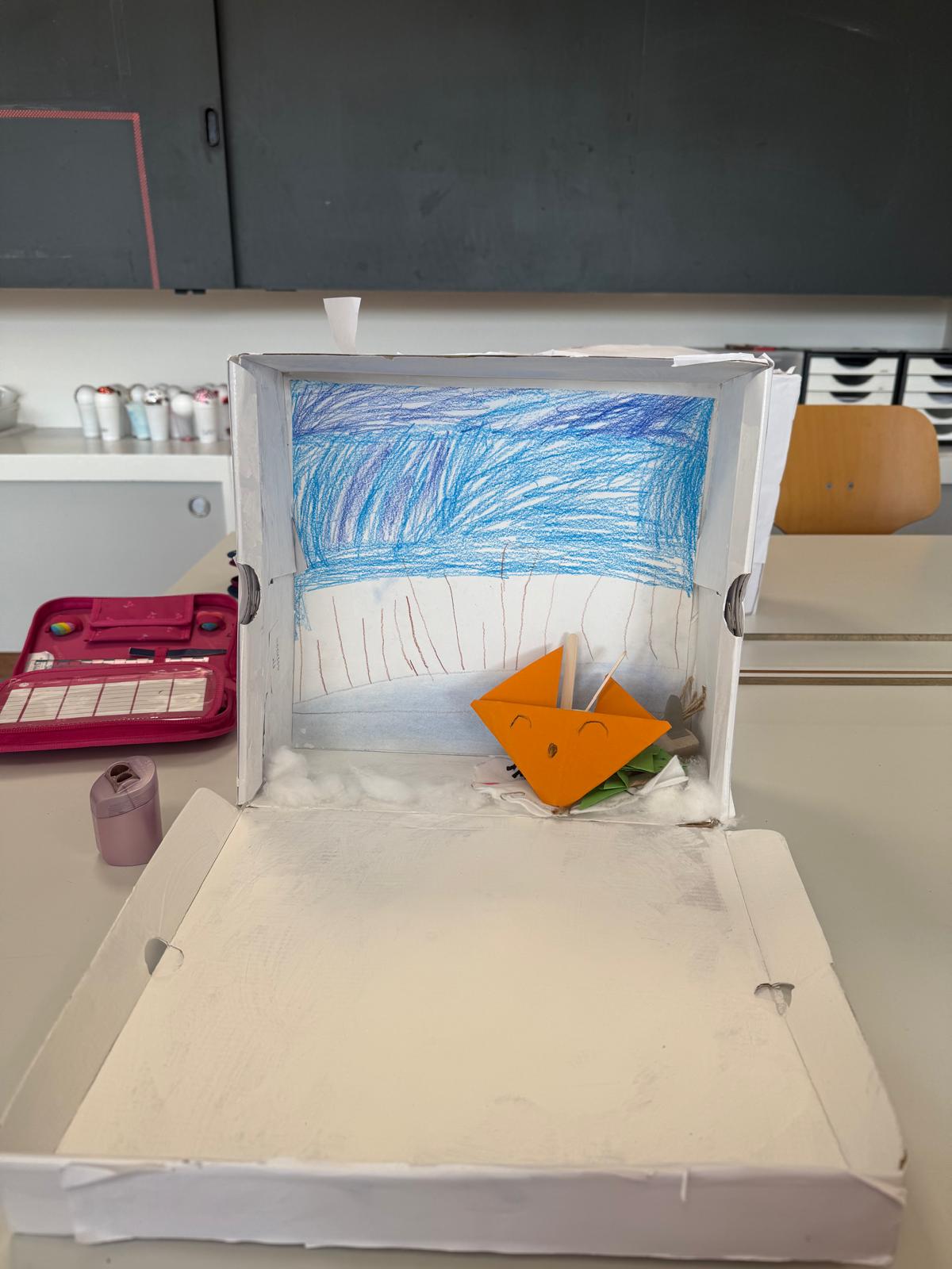 eigenen Märchenbox. Denn das Ziel war es, diese Geschichte zu spielen. Dazu wurden Schuhschachteln als Spielbühne verwendet. Diese wurde mit einem Winterlandschaftsbild und Schneeflocken