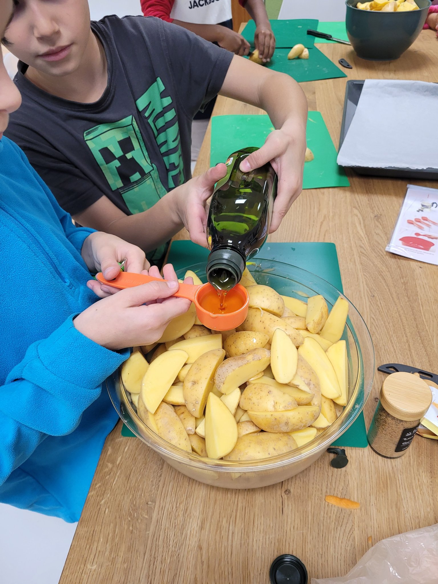 Das Highlight für uns ist das gemeinsame Mittagessen, welches wir selbst zubereitet und gekocht haben. Wir haben geschält, gerüstet, geschnitten, geknetet, gebacken, gekocht und zum Schluss alles wieder gewaschen und geputzt.