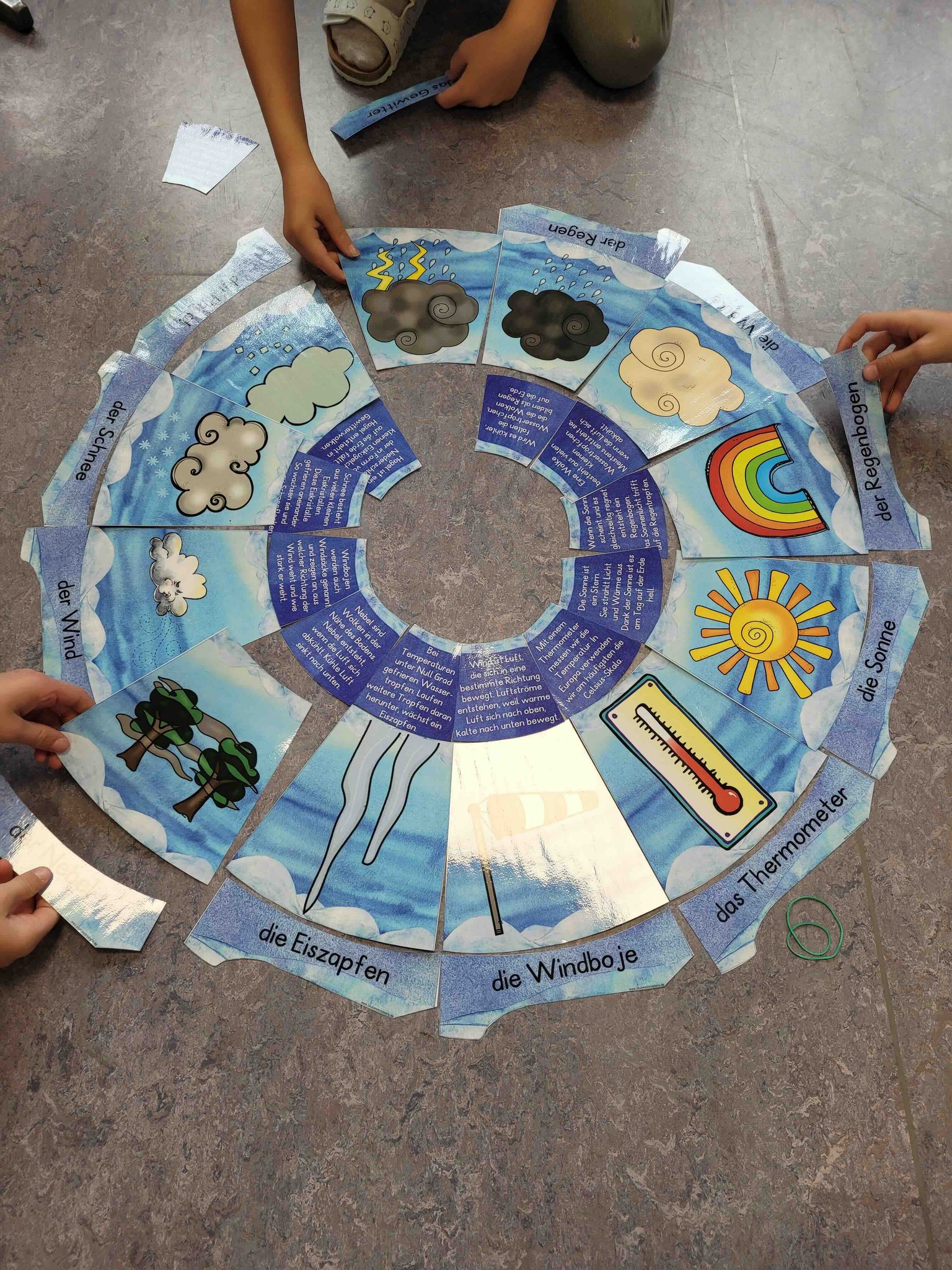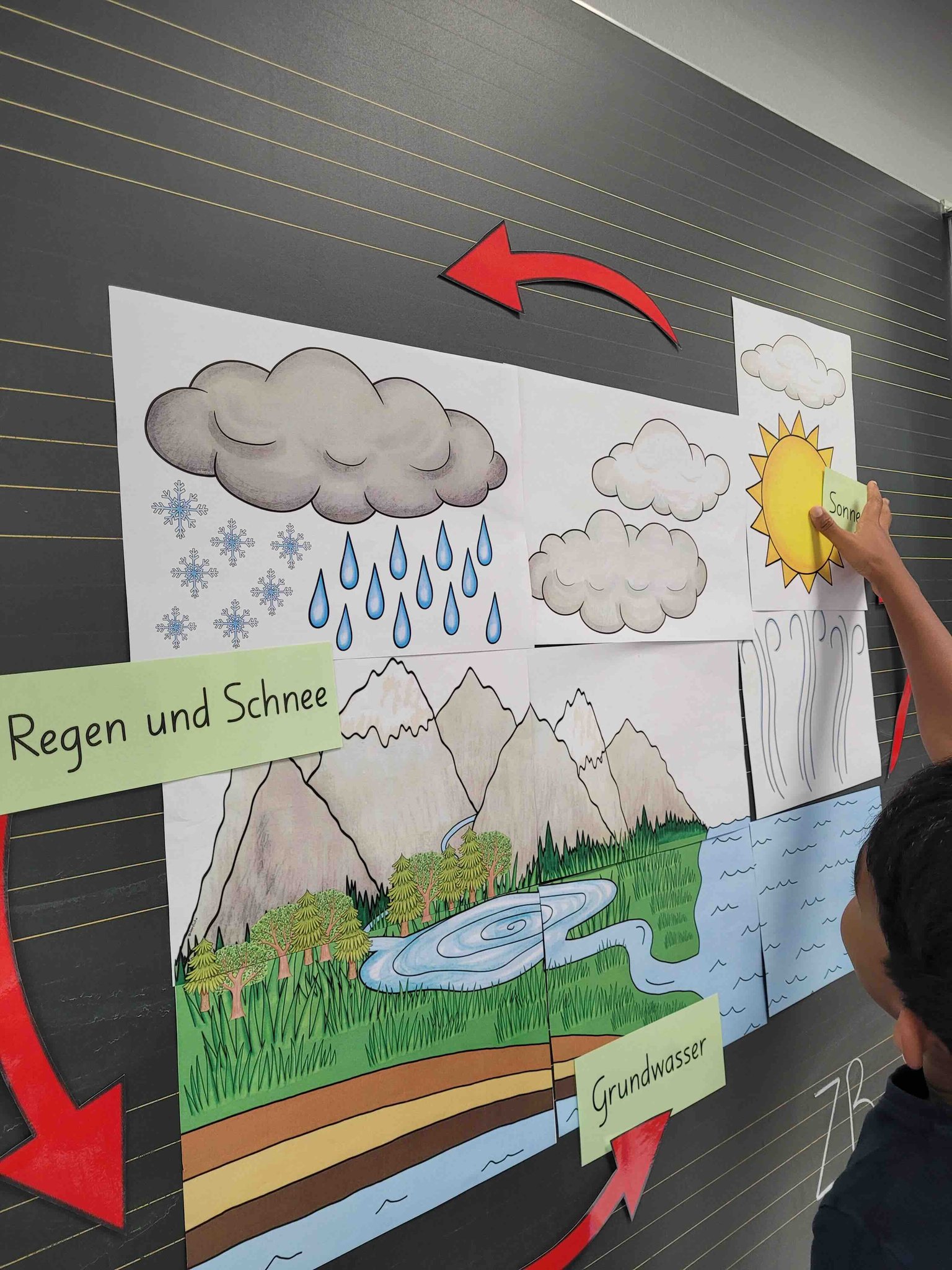 Wir haben die Geschichte von „Plock, dem Regentropfen“ gehört, der mit seinen Freunden und seiner Familie auf die Erde kommt, im Boden versickert und mit tausenden anderen Regentropfen zuerst im Bach, dann im Fluss und zuletzt mit dem Strom ins Meer fliesst. Schliesslich verdunstet er und wird von der Sonne wieder in die Wolken befördert, wo er abkühlt und kondensiert. So beginnt der ganze Wasserkreislauf von vorne.