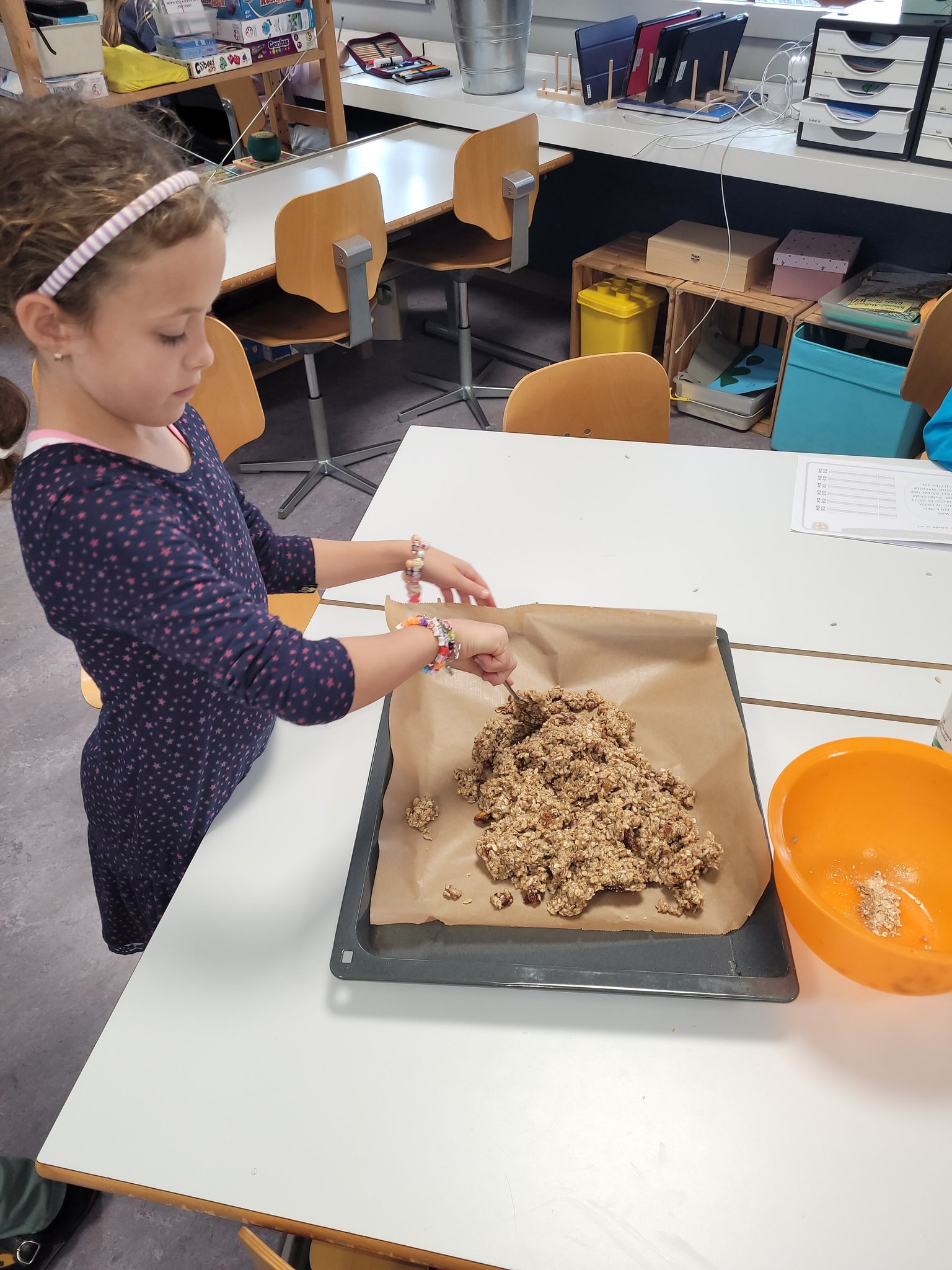 Und aus Haferflocken, getrockneten Aprikosen und etwas Honig haben wir uns einen Getreideriegel fürs Zvieri gebacken.