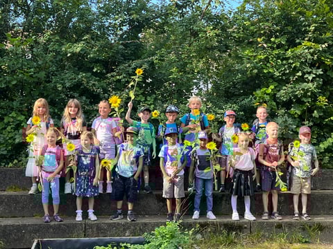 der Sonnenblume in der Hand durch die schön geschmückten Spalierbögen, die von den Zweitklässler*innen gehalten wurden.