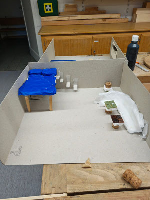 Zuerst haben wir uns gemeinsam überlegt, wie man so ein Zimmer eigentlich baut. Mit dem Lineal wurde genau gemessen, die Grössen berechnet und dann mit dem Japanmesser aus Karton der Boden und die Wände zugeschnitten. Dabei war viel Sorgfalt gefragt, damit am Ende alles stabil zusammenhält.