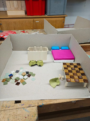 Nachdem die Grundform stand, ging es ans Einrichten – und hier konnte die Fantasie richtig sprudeln! Aus den unterschiedlichsten Materialien wie Holz, Karton, WC-Rollen, Korken, Zahnstochern, Eierschachteln, Styropor oder Mosaiksteinen entstanden Möbelstücke aller Art. Einige Kinder griffen auf die vorbereiteten Anleitungen zurück, die meisten hatten jedoch so viele eigene Ideen, dass sie einfach loslegten. Besonders beliebt waren Fernseher und Nintendo-Switch-Konsolen, aber auch Hochbetten, Himmelbetten oder sogar ein kleines Bällebad zum Hineinspringen wurden erfunden. Anschliessend durfte alles nach Lust und Laune bemalt, mit Mosaik verziert oder mit Seidenpapier dekoriert werden.