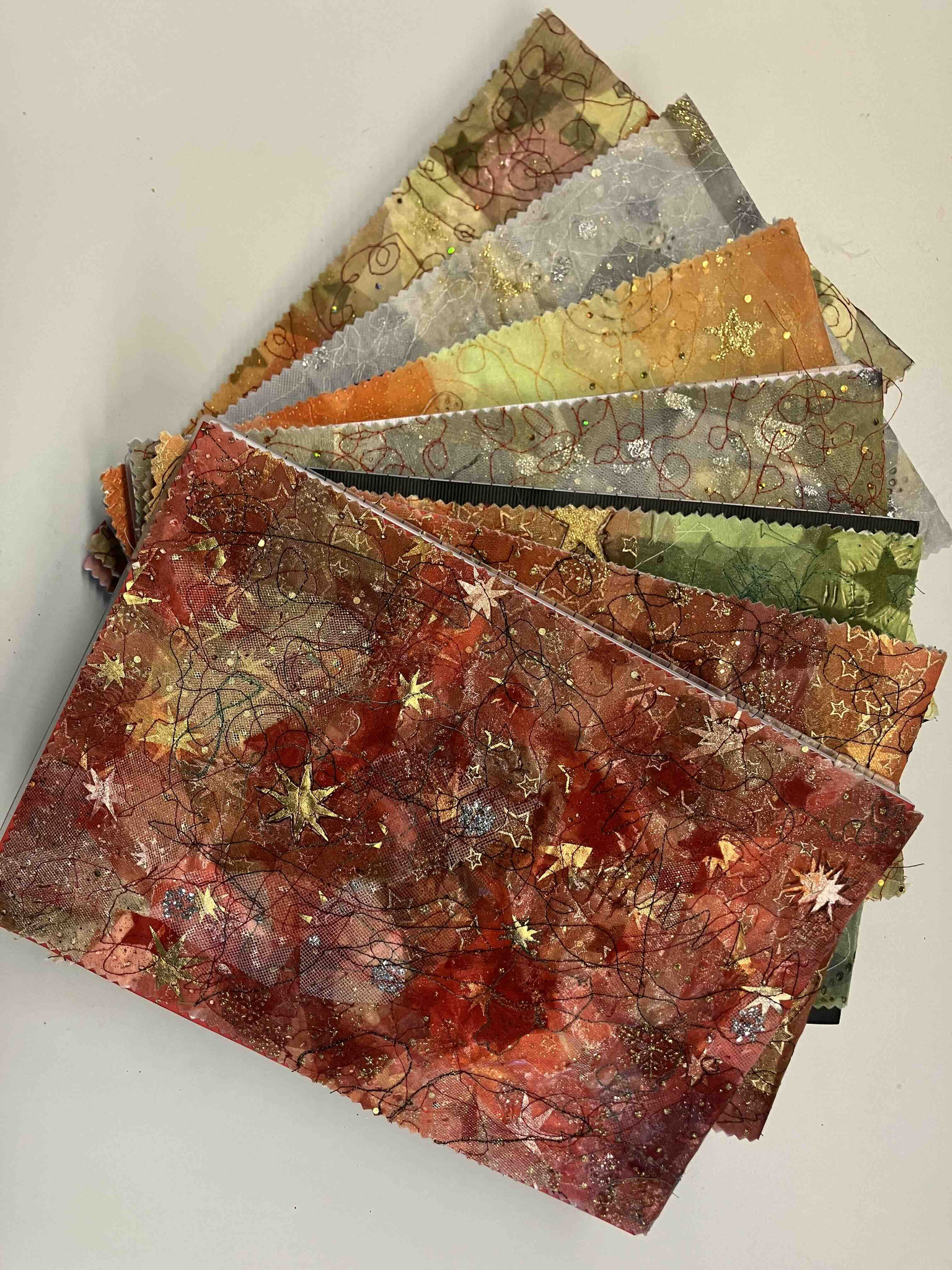 Dafür schneiden wir zuerst 5 Stoffe in der Grösse eines A4 Blattes zu. Diese müssen unbedingt im Fadenlauf zugeschnitten werden.