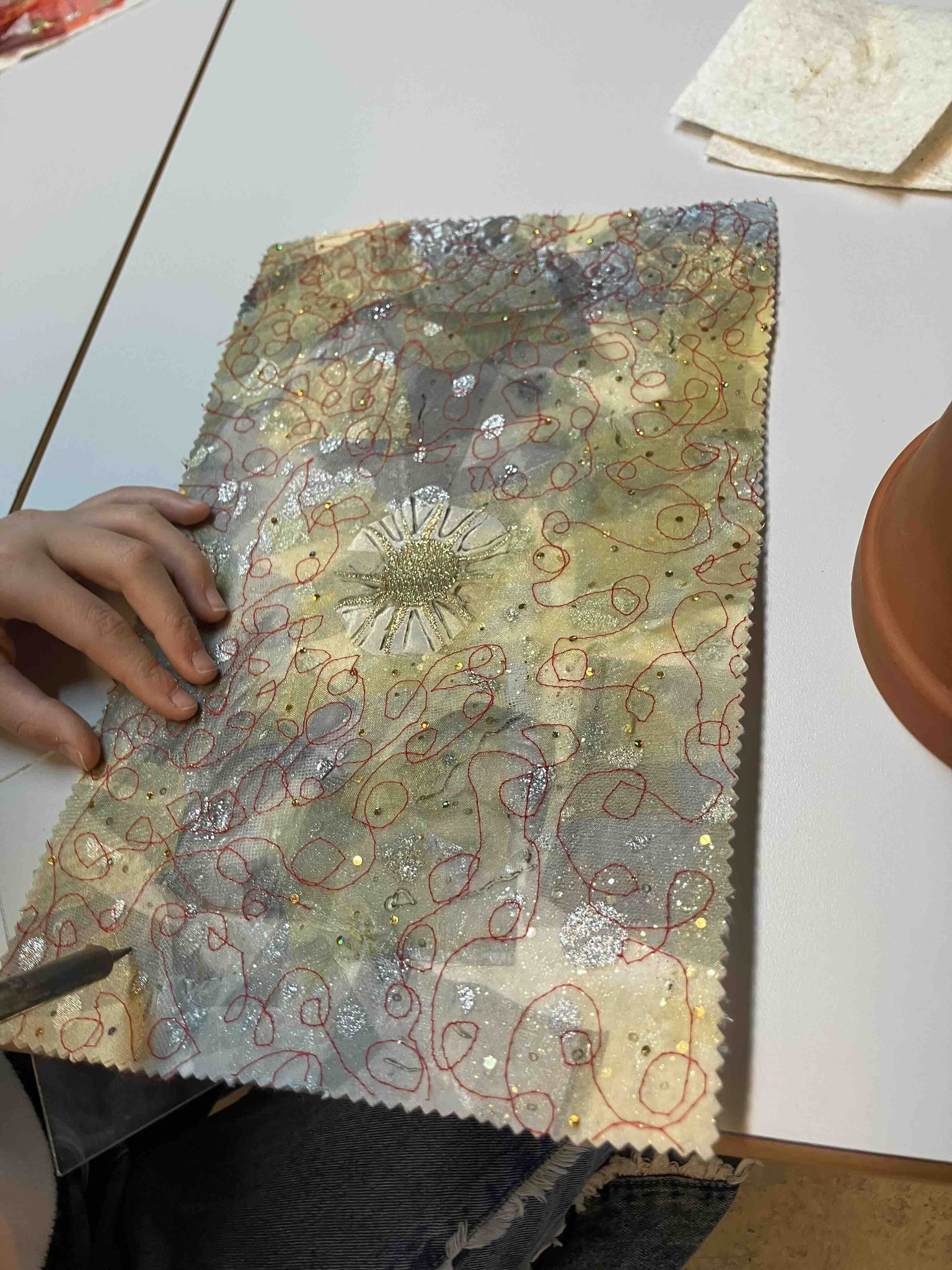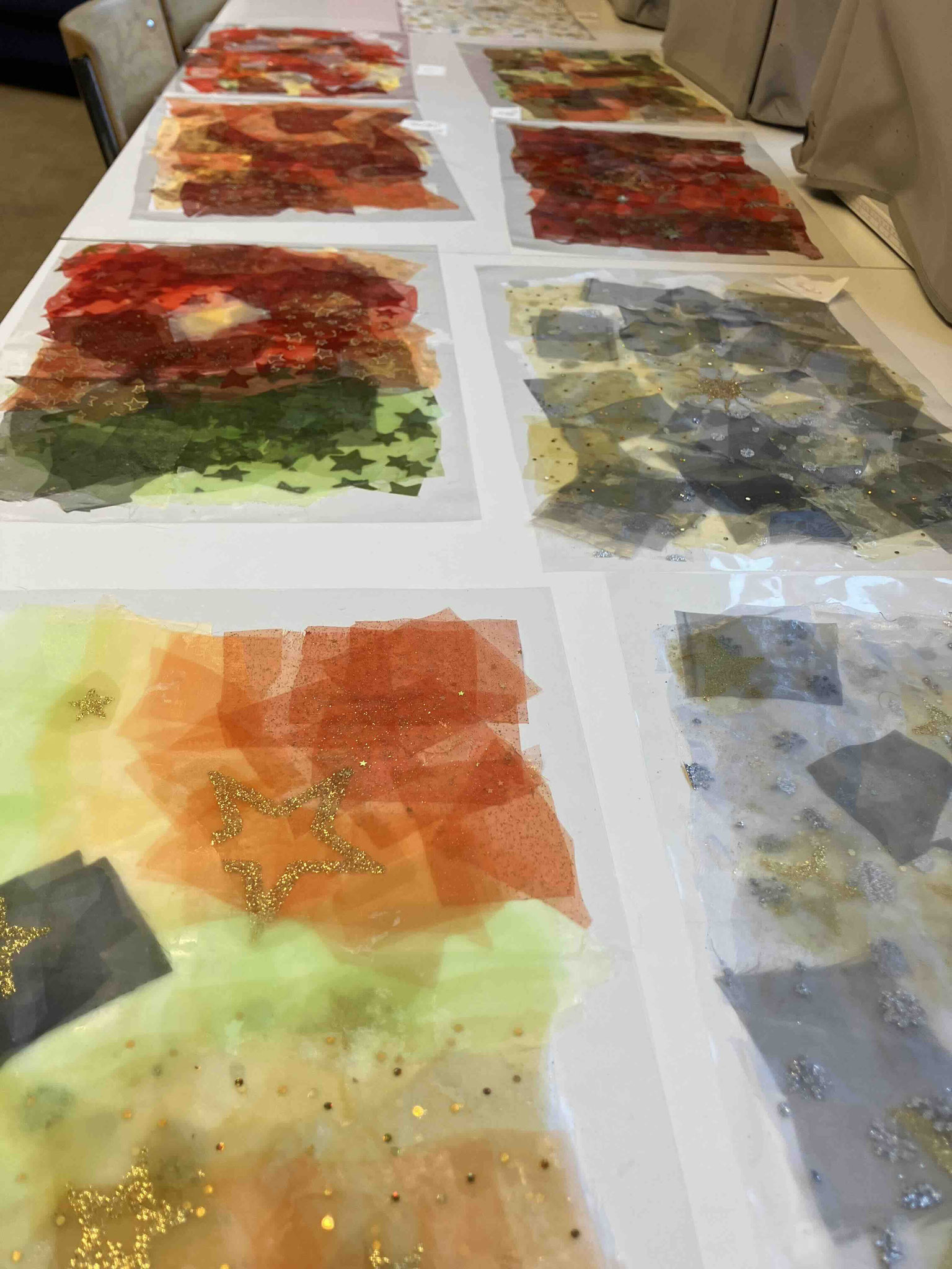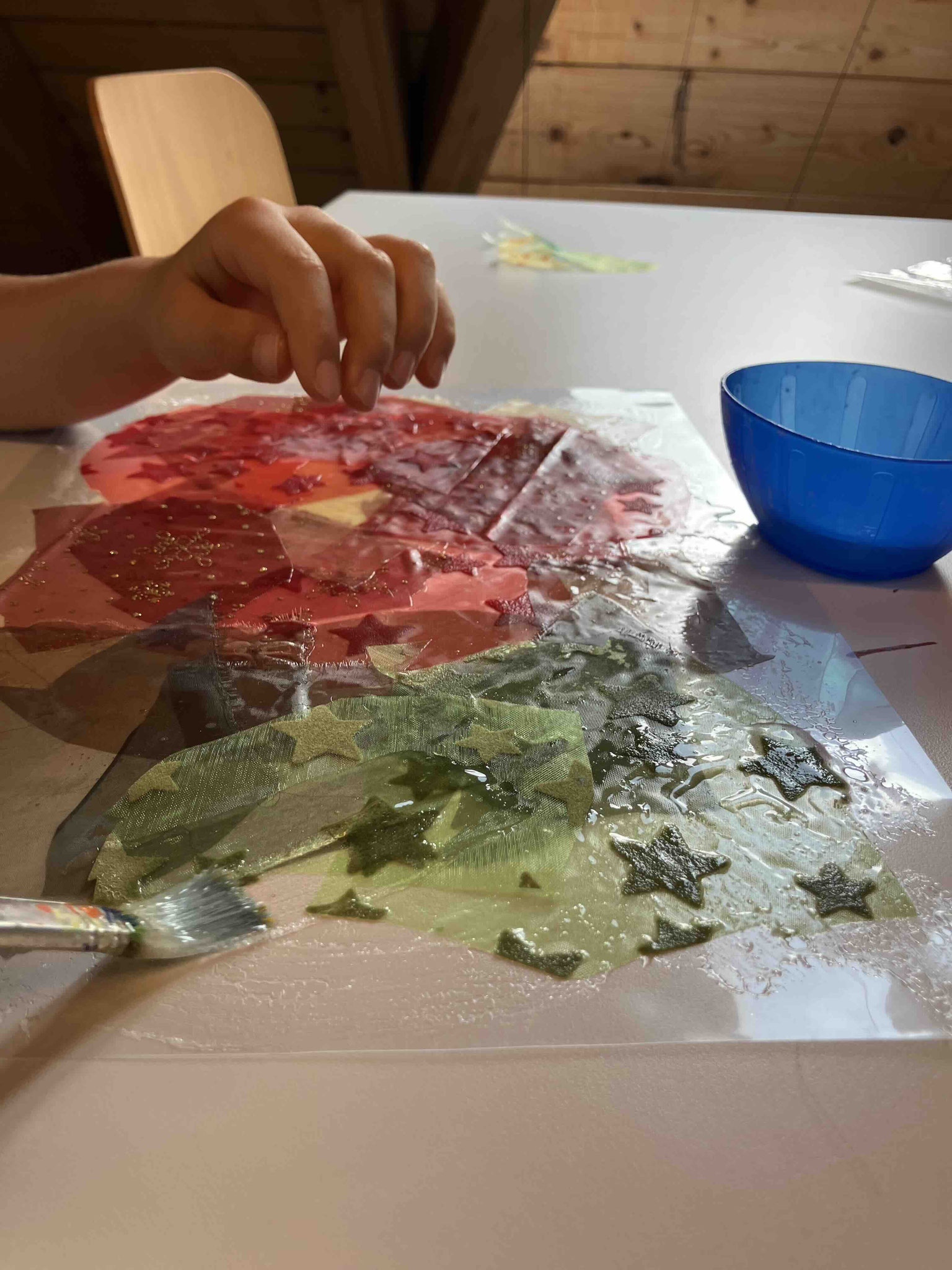 Aber von Anfang an: Wir haben vor uns eine grosse Auswahl an verschiedenfarbigen Organzastoffen. Aus diesen Stoffen schneiden wir Stücke zu und Kleistern diese auf ein Plastikmäppchen – dies braucht etwas Durchhaltevermögen, da unser Kleisterbild überall aus drei Schichten bestehen muss.