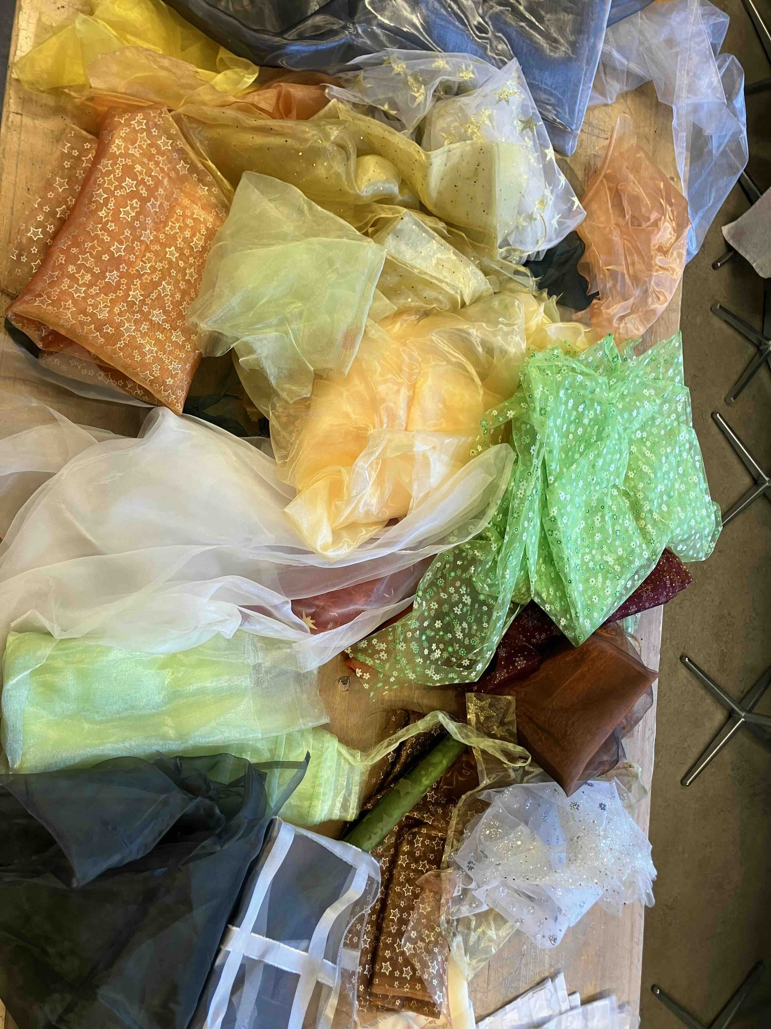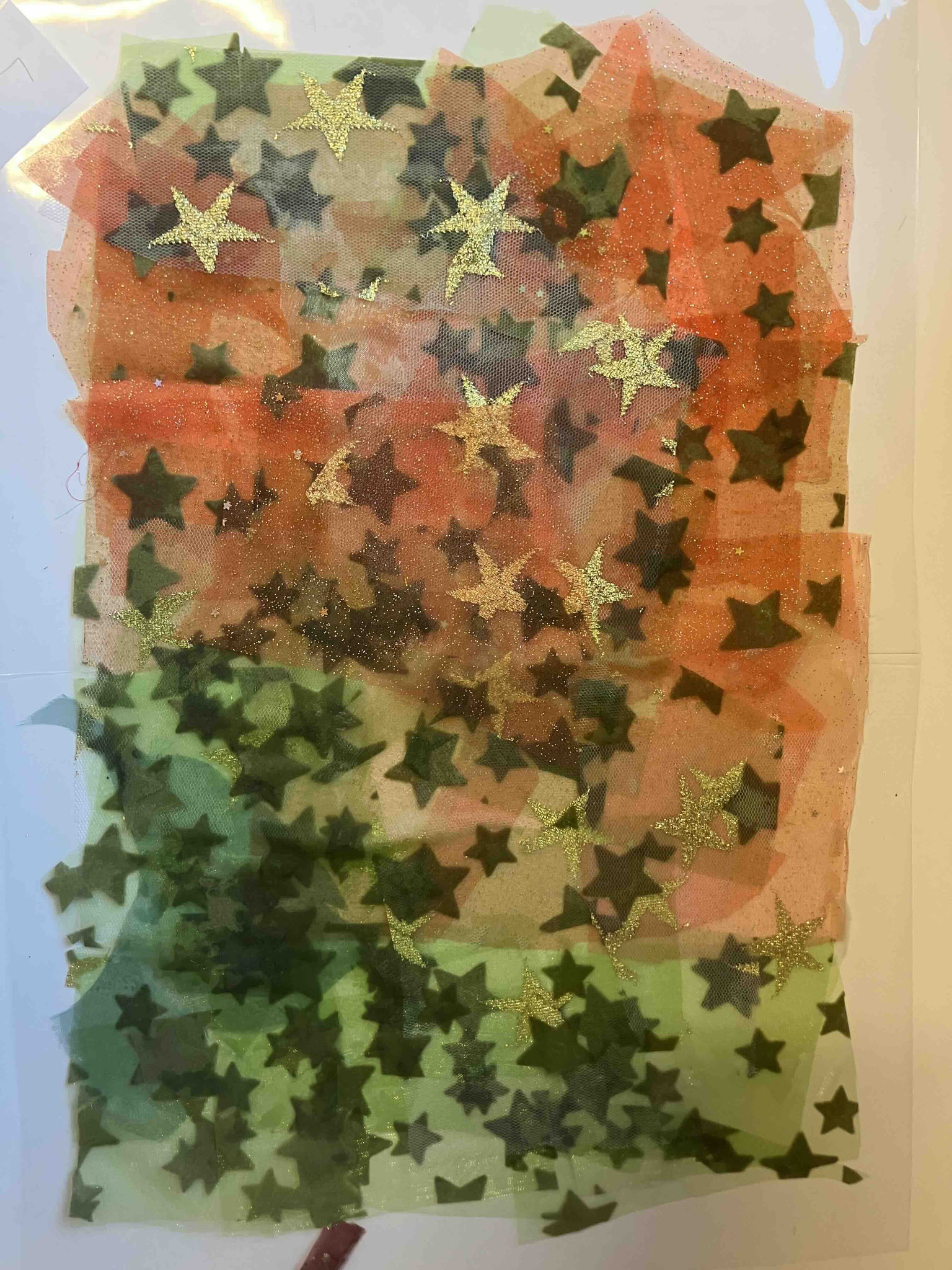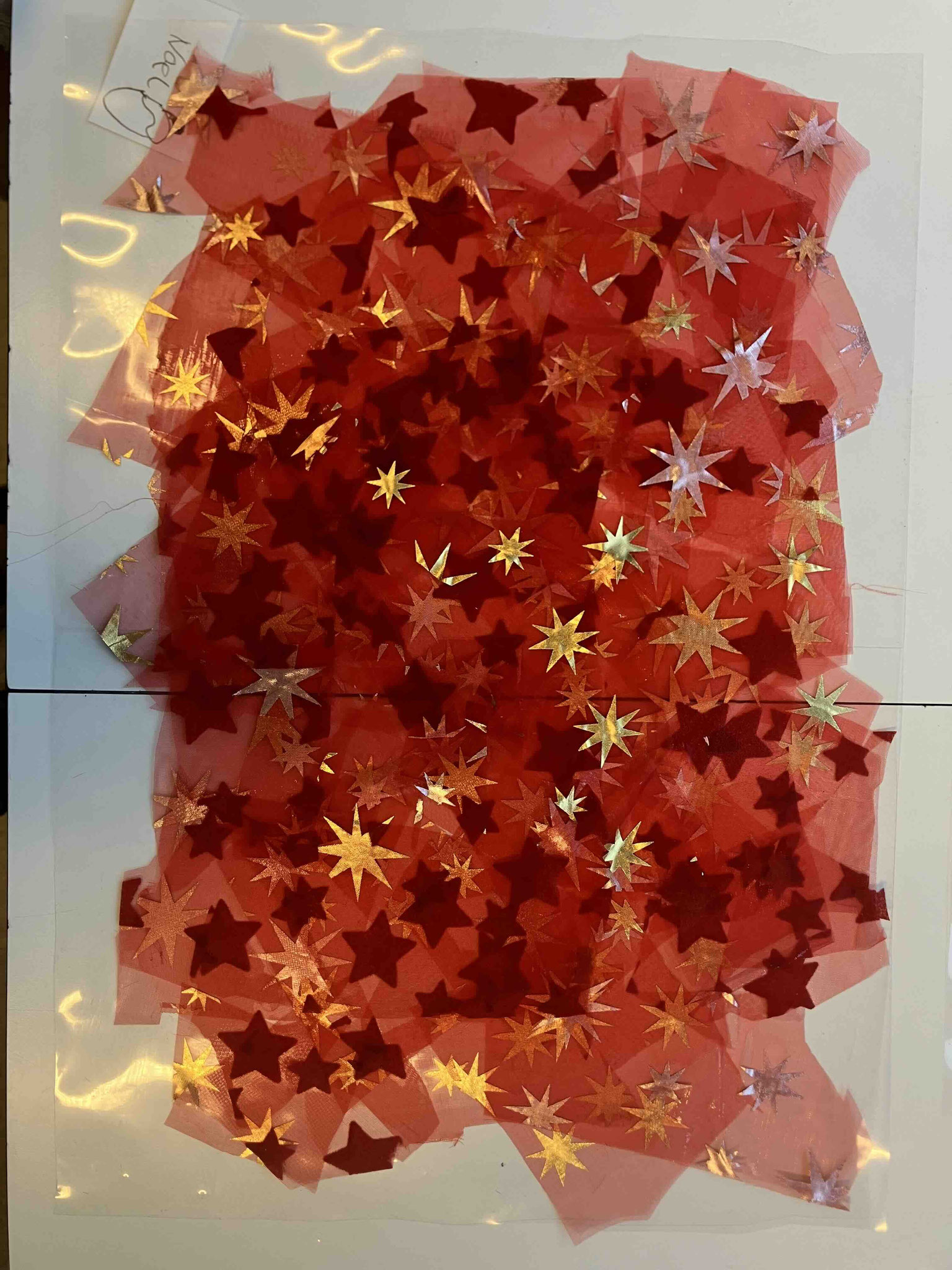 Aber von Anfang an: Wir haben vor uns eine grosse Auswahl an verschiedenfarbigen Organzastoffen. Aus diesen Stoffen schneiden wir Stücke zu und Kleistern diese auf ein Plastikmäppchen – dies braucht etwas Durchhaltevermögen, da unser Kleisterbild überall aus drei Schichten bestehen muss.
