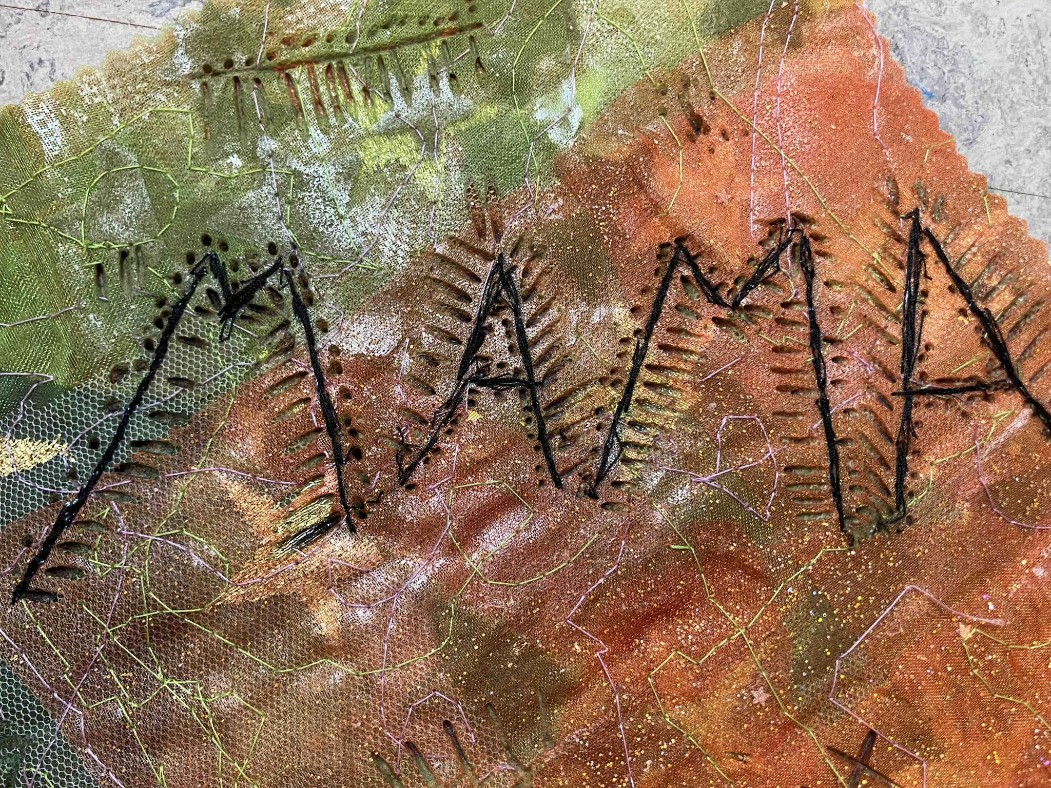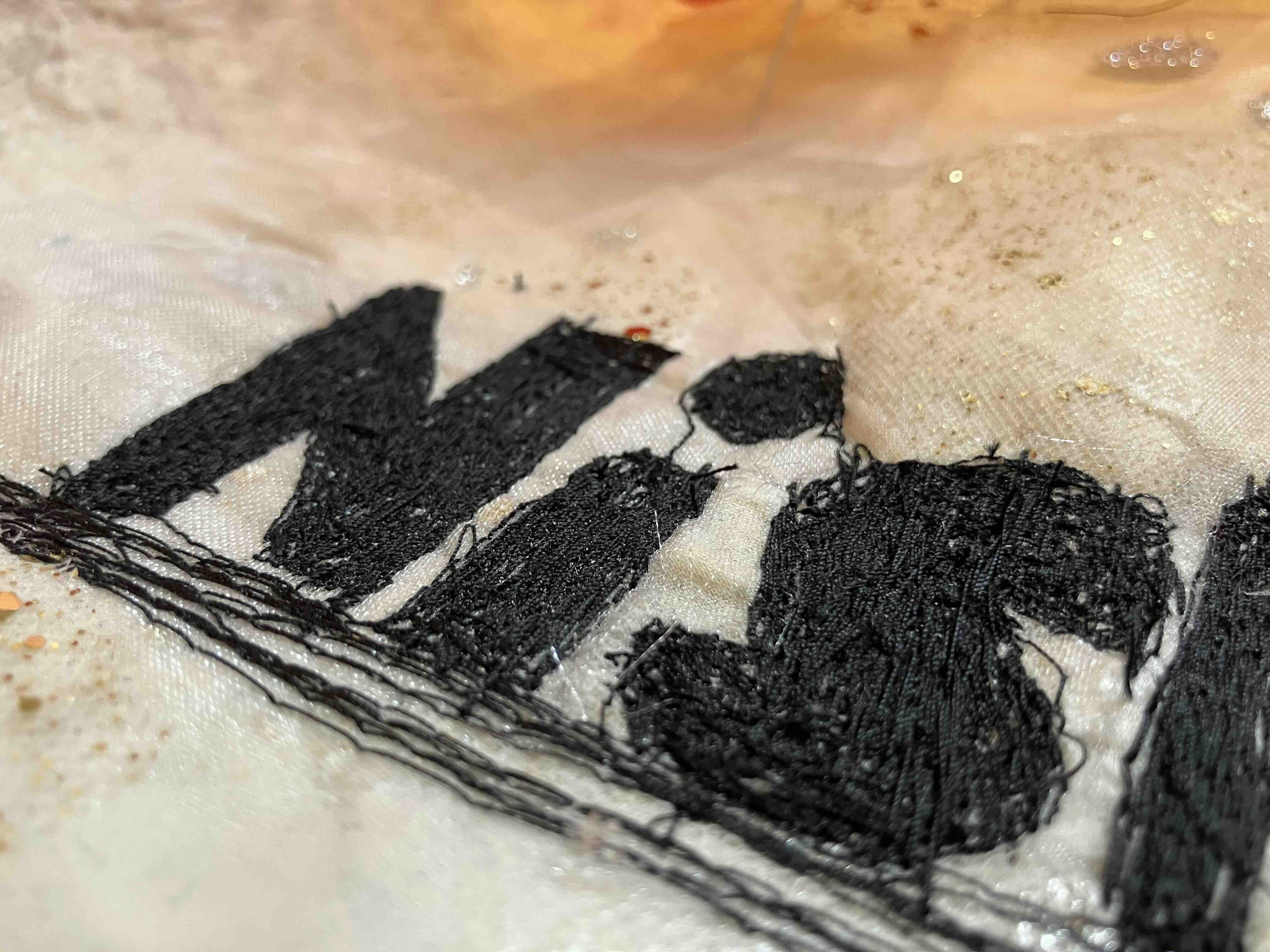 Jetzt heben wir noch gewisse Stellen des Druckes heraus, indem wir diese mit der Nähmaschine besticken.