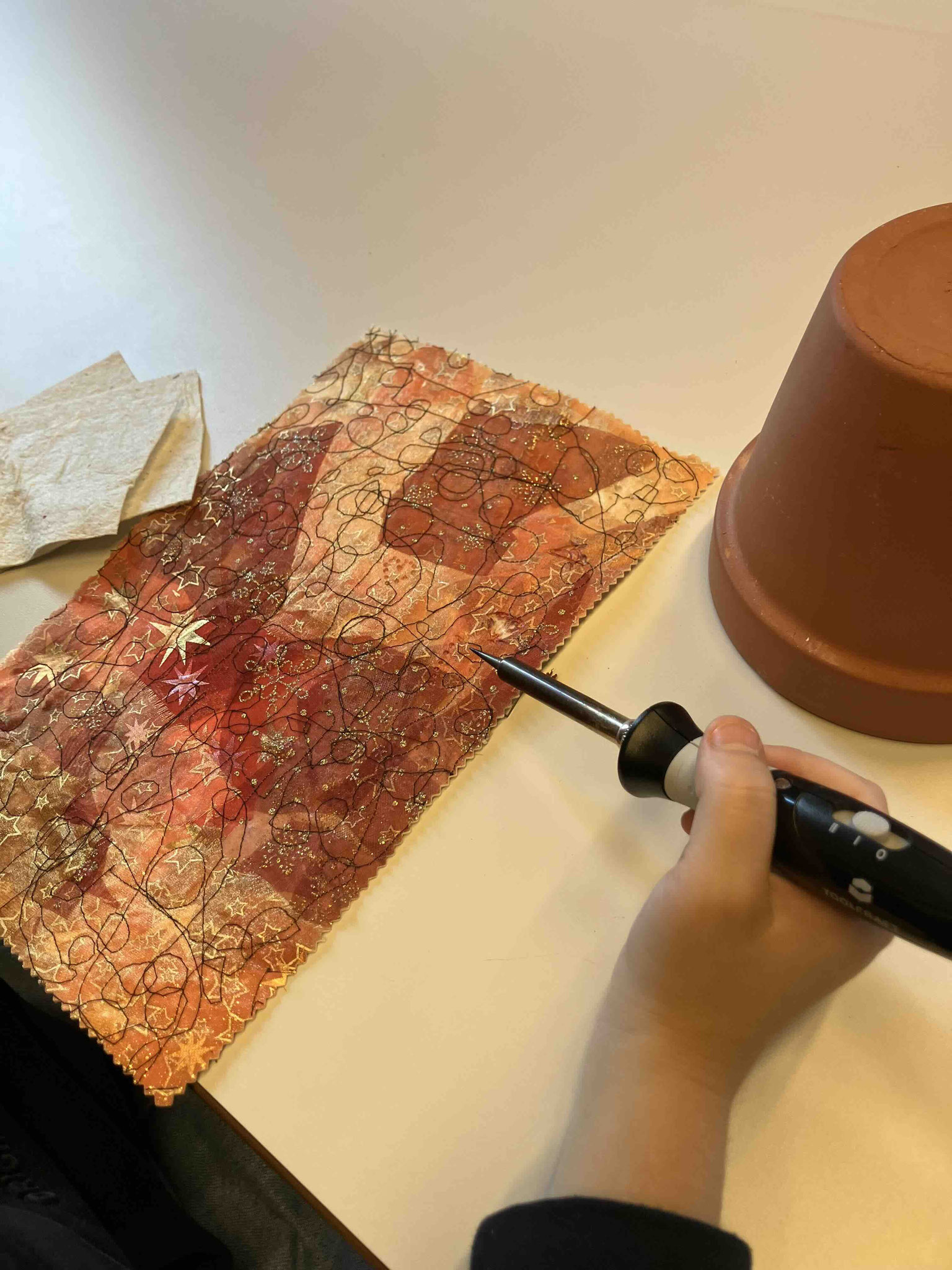 Nun kommen wir endlich zum Löten. Mit den Lötkolben können wir nun Muster in unseren selbst gestalteten Stoff löten und ihn somit noch mehr verzieren. Da der Organzastoff aus Chemiefaser besteht, lässt er sich bestens «schmelzen»