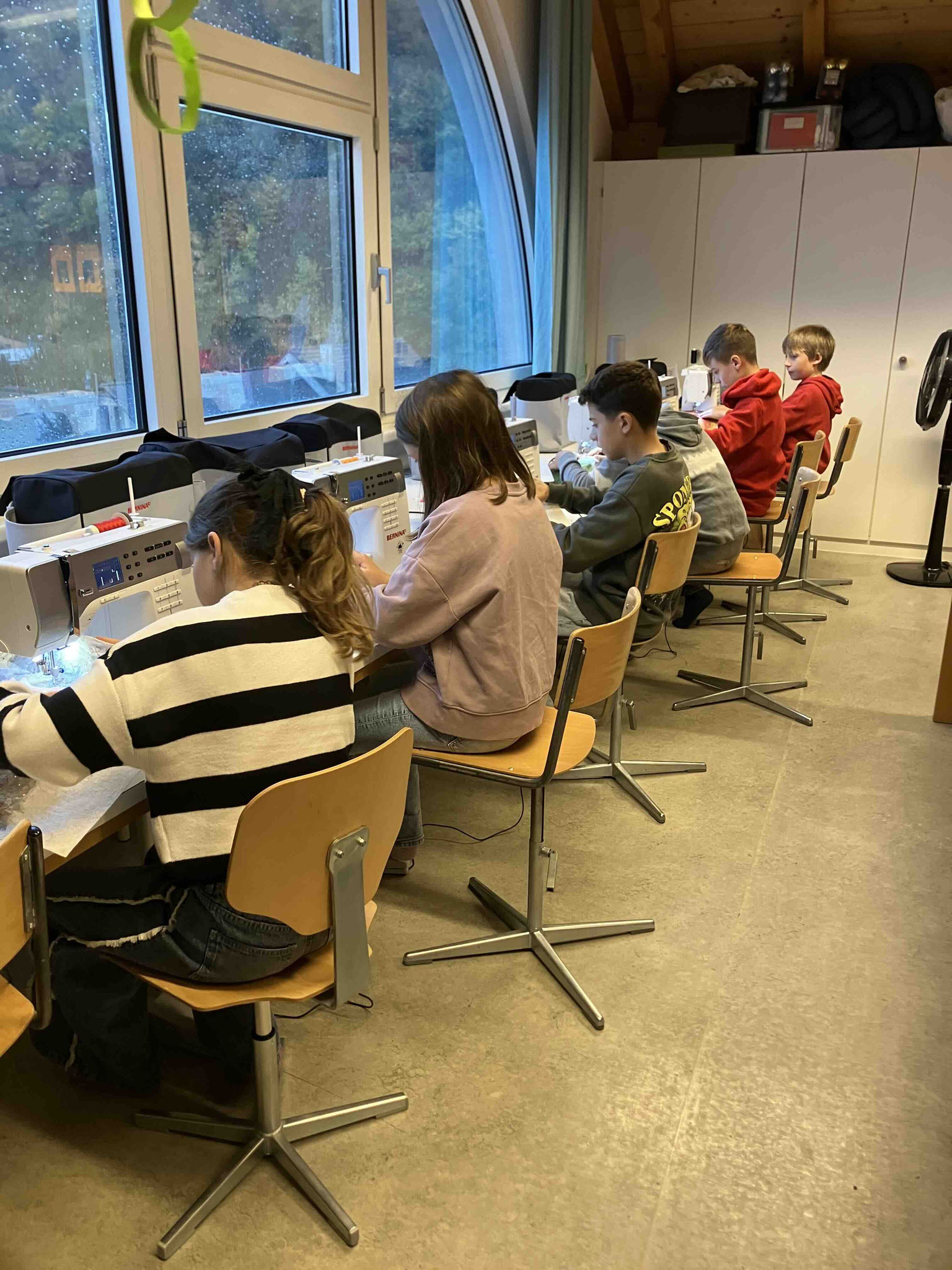 dürfen und die Maschine losrattert, freuen sich, wenn sie schon bald ohne Faden Kurven und Zick-Zack-Linien auf Papier nähen können, üben fleissig das Einfädeln der verschiedenen Fäden und sind