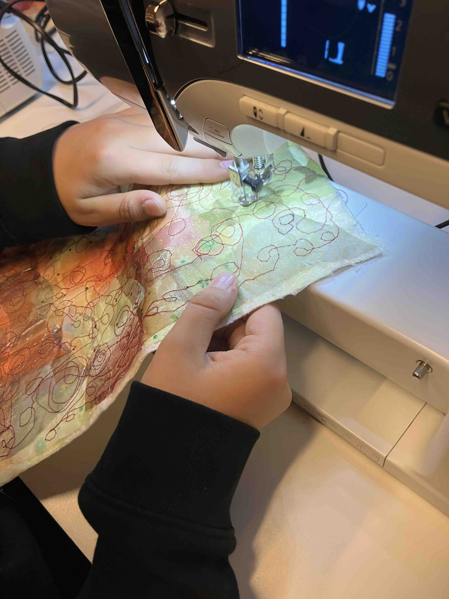 Wir 4. Klässler nähen ein Necessaire aus einem selbst hergestellten Stoff.
